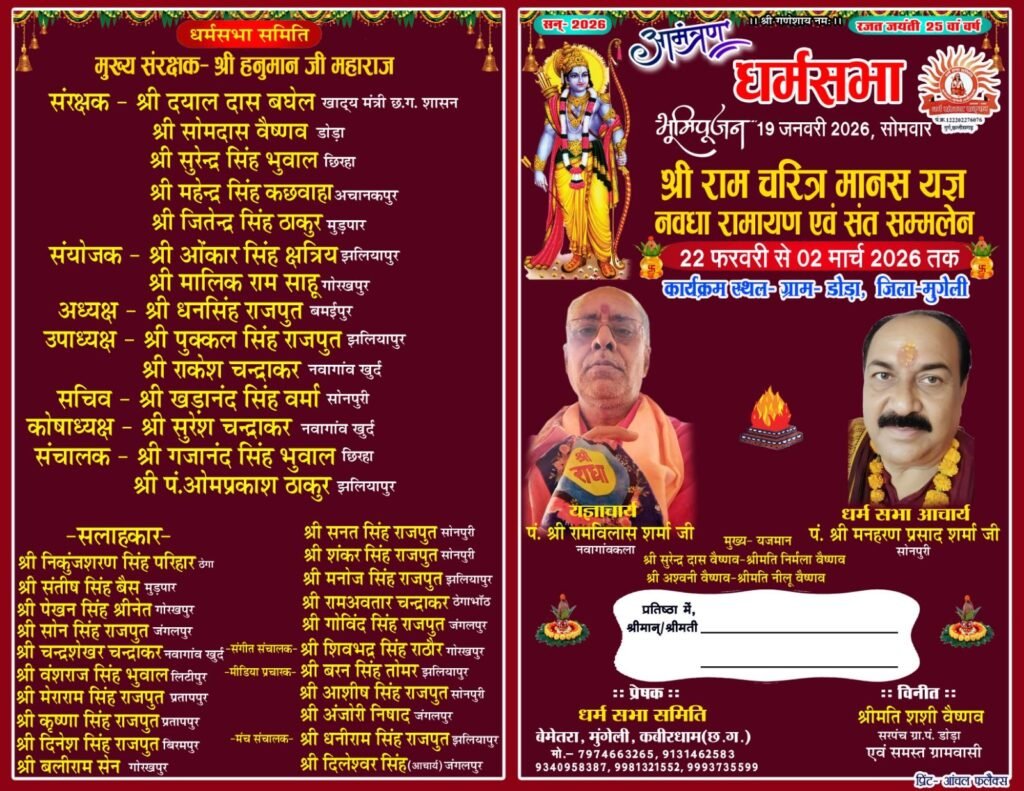 मुंगेली। जिला मुंगेली के ग्राम डोड़ा में धर्मसभा समिति के तत्वावधान में श्री रामचरितमानस यज्ञ, नवधा रामायण एवं संत सम्मेलन का आयोजन किया जा रहा है। इस धार्मिक आयोजन के अंतर्गत 19 जनवरी 2026, सोमवार को भूमि पूजन कार्यक्रम संपन्न होगा, जबकि मुख्य आयोजन 22 फरवरी से 2 मार्च 2026 तक चलेगा। यह आयोजन धर्मसभा के 25वें वर्ष (रजत जयंती वर्ष) के रूप में मनाया जाएगा।भूमिपूजन कार्यक्रम के मुख्य अतिथि विधायक मुंगेली एवं पूर्व खाद्य मंत्री पुन्नूलाल मोहले होंगे। कार्यक्रम की अध्यक्षता भाजपा जिला कोषाध्यक्ष सोमदास वैष्णव करेंगे। विशिष्ट अतिथियों में जिला पंचायत अध्यक्ष श्रीकांत पाण्डेय, भाजपा जिला अध्यक्ष दीनानाथ केशरवानी, पूर्व सांसद लखनलाल साहू, जनपद अध्यक्ष रामकमल सिंह परिहार, नगर पालिका अध्यक्ष रोहित शुक्ला सहित अनेक जनप्रतिनिधि एवं सामाजिक पदाधिकारी शामिल रहेंगे।